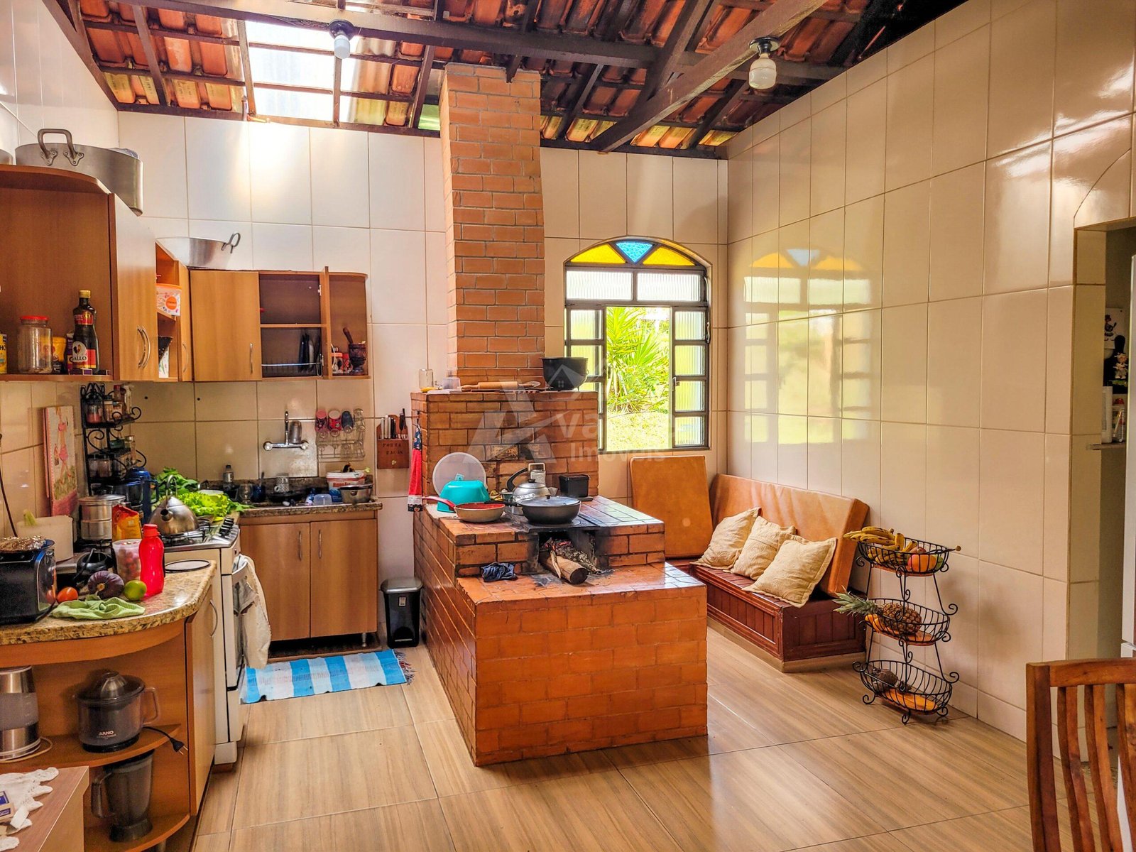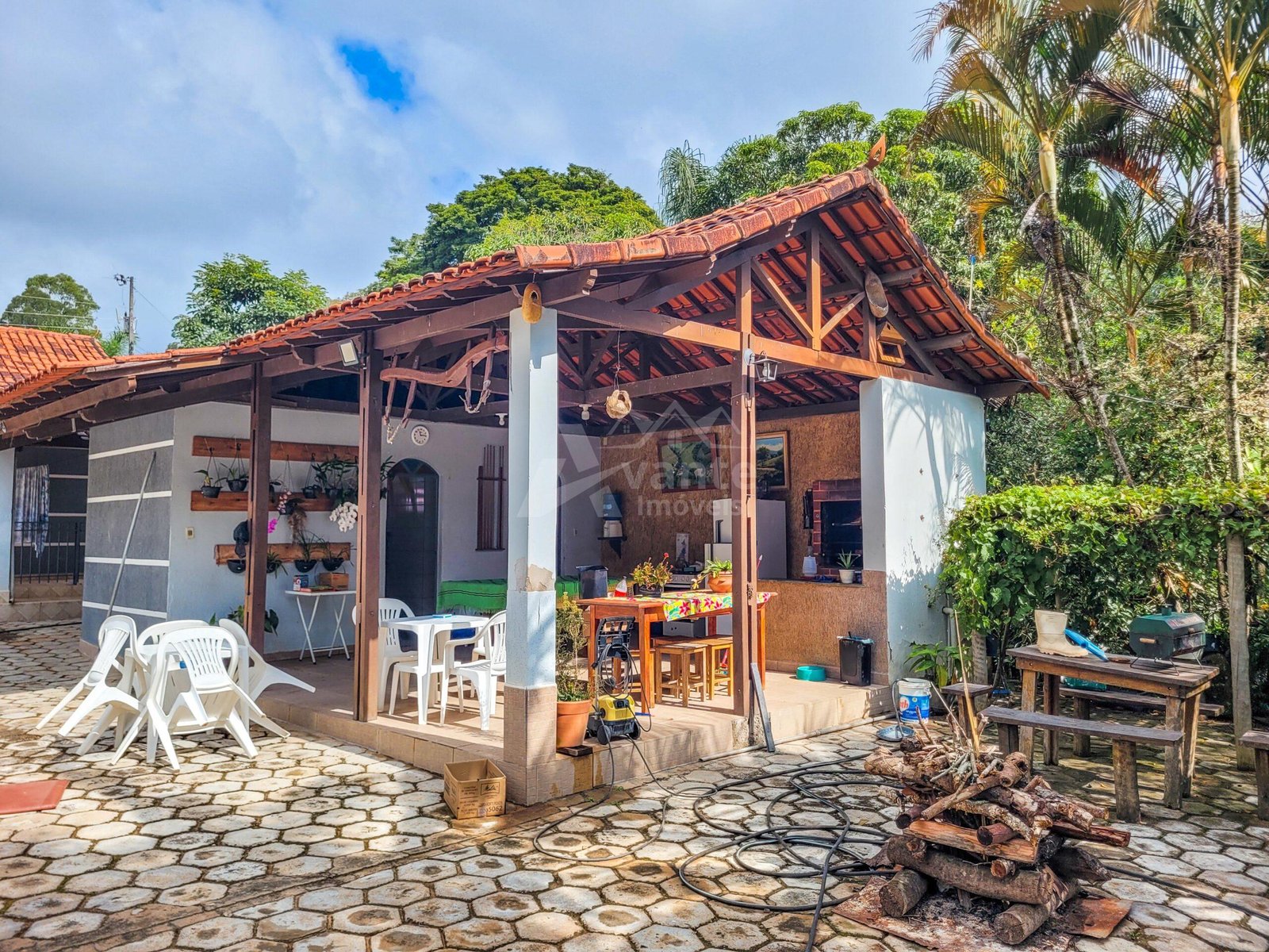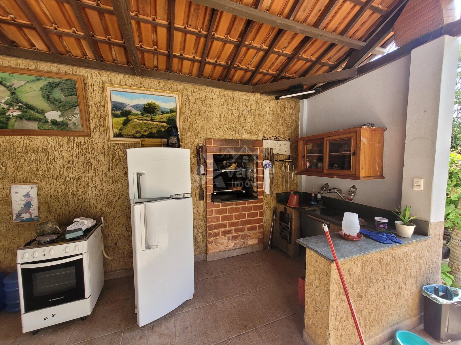 Uma bela área gourmet compõe a casa principal, com fogão à lenha e churrasqueira.