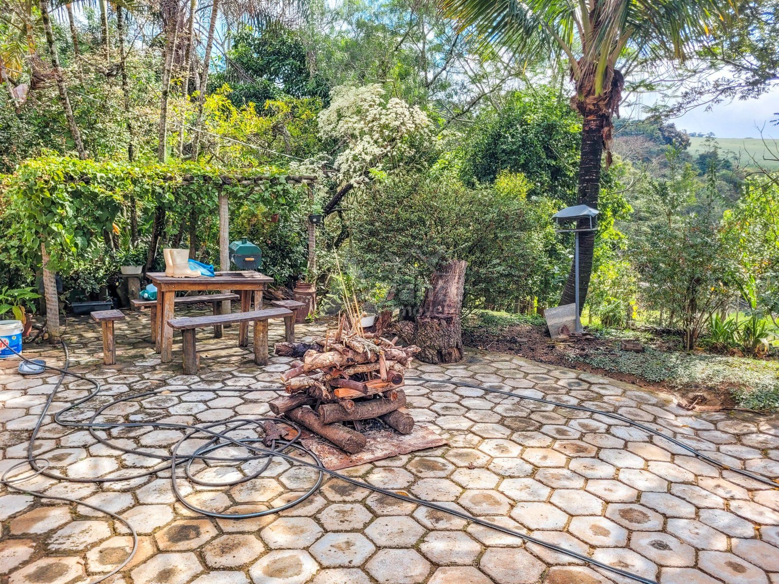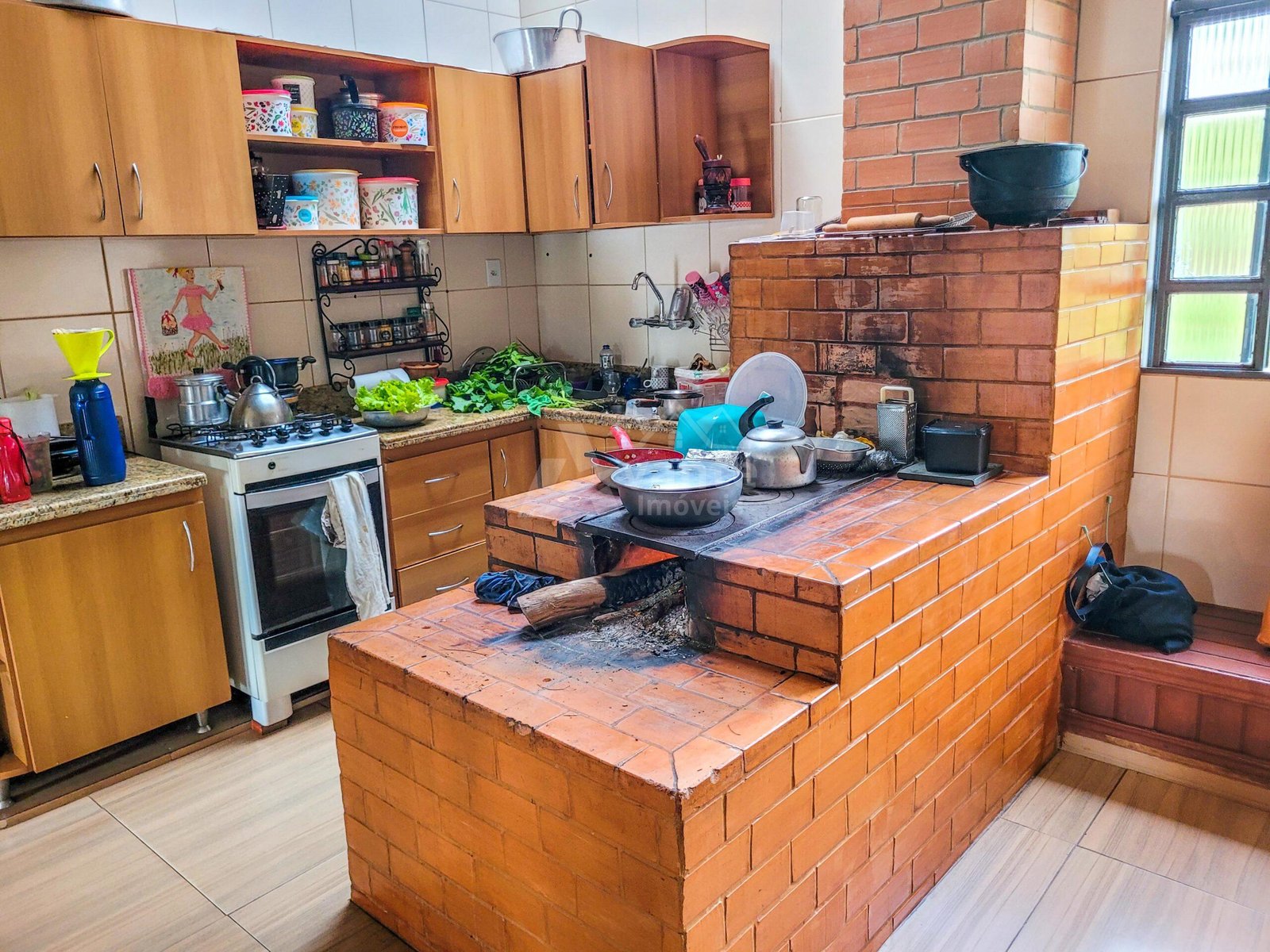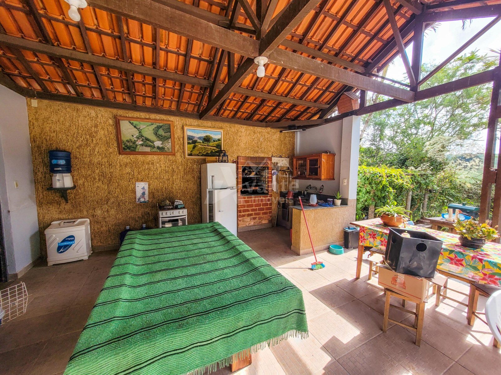 Uma bela área gourmet compõe a casa principal, com fogão à lenha e churrasqueira.